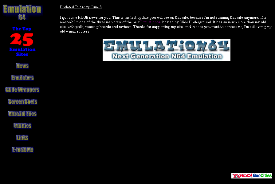 Not much later, Stian asked Martin if the latter would be kind enough to update his site during a two week vacation he had. Martin though about it a bit, and was unsure. Somehow, and I can't remember who it was who came up with the idea, the two Scandinavians, together with Luigi from the Unofficial UltraHLE page, formed a much more comprehensive and serious site. The major gaming site Glide Underground showed interest in hosting the N64 emulation only site, and on launch day (June 7, 1999), it had more than 1000 visitors.