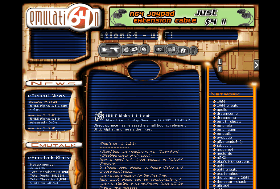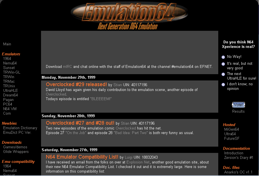 While lagging around on IRC, Martin came in contact with Ztnet founder Zach (Lev). He offered hosting with Ztnet, and the offer was gladly accepted. The Emulation64 network has grown ever since, and it is hosting emulators as well as emulation sites.