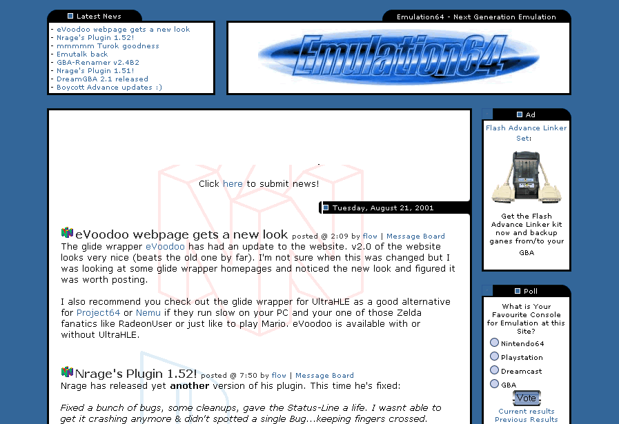 The next step in the Emu64 history was when the site started using Post-Nuke, but without changing the layout. The site now covered GBA and PS2 emulation as well.